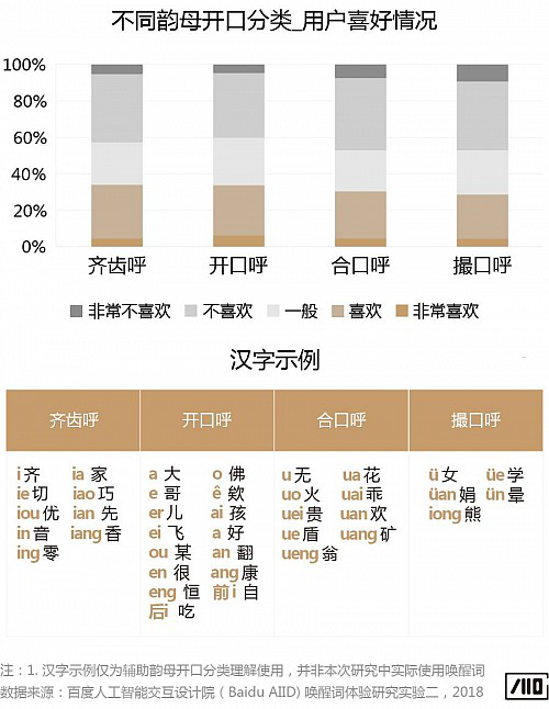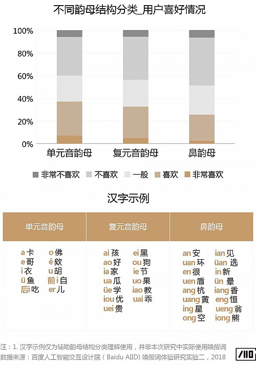 韻母: 按照韻母發音時的口型開口情況來看,用戶更喜歡開口口型較大的齊口呼和開口呼;另外按照韻母結構來看,音節韻母為單韻母的詞最受用戶的喜歡。