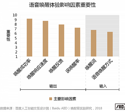 百度AI交互設計院基于大量的對智能語音交互產品用戶測試的經驗,發現影響語音喚醒體驗的因素包含兩個維度——輸入和輸出。輸入環節的影響因素包括喚醒詞、喚醒方式,輸出環節的影響因素包括喚醒響應速度、喚醒反饋方式、喚醒成功率和誤喚醒率。為了確定影響語音喚醒體驗的主要因素,我們通過問卷調查的方法對其重要性進行了研究。調查結果發現,對于用戶來說,喚醒詞是語音喚醒輸入環節中較為重要的影響因素,且一個好的喚醒詞,會直接影響喚醒率。
