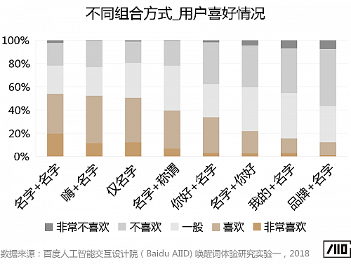 首先,我們對市場上各類語音交互設備喚醒詞的組合方式進行拆解,發現喚醒詞均是在一個簡單“名字”的基礎上加以變化而構成,此外,“名字”本身也具備不同的構成方式。在實驗中,我們為用戶提供了不同組合方式的喚醒詞,由用戶根據其個人喜好程度在5點量表上進行評價(1-非常不喜歡、2-不喜歡、3-一般、4-喜歡、5-非常喜歡)。