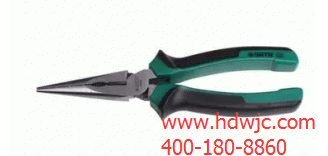 尖嘴鉗又叫修口鉗,主要用來剪切線徑較細 的單股與多股線,以及給單股導線接頭彎圈、剝塑料絕緣層等,它也是電工(尤其是內線電工) 常用的工具之一。電工用尖嘴鉗的鉗柄上套有額定電壓500V的絕緣套管。尖嘴鉗由于頭部較尖,使用與狹小空間的操作使用用尖嘴鉗彎導線接頭的操作方法是:先將線頭向左折,然后緊靠螺桿依順時針方向向右彎即成。