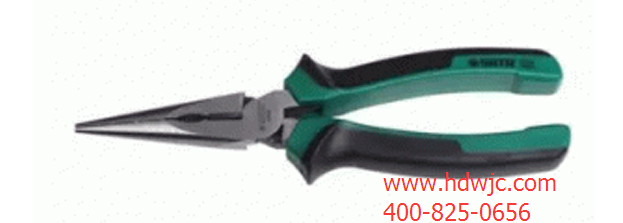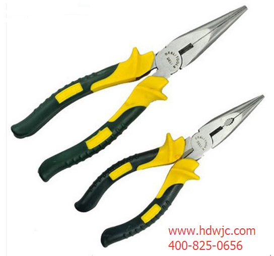 尖嘴鉗在合起來的時候是呈錐形的。是電工(尤其是內線電工)常用的工具之一。主要用來剪切線徑較細的單股與多股線以及給單股導線接頭彎圈、剝塑料絕緣層以及夾取小零件等使用時,必須熟知工具的性能、特點、使用、保管和維修及保養方法。各種施工工具必須是正式廠家生產的合格產品。工作前必須對工具進行檢查,嚴禁使用腐蝕、變形、松動、有故障、破損等不合格工具。