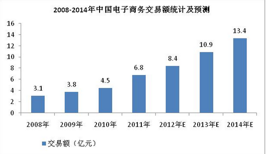 【摘要】根據國家統計局數據:2014年我國電子商務交易額(包括B2B和網絡零售)達到約13萬億元,同比增長25%。全年網上零售額同比增長49.7%,達2.8萬億元。2015年一季度,網上服務零售額1297億元,增長43.0%,網上商品零售額6310億元,增長41.0%。