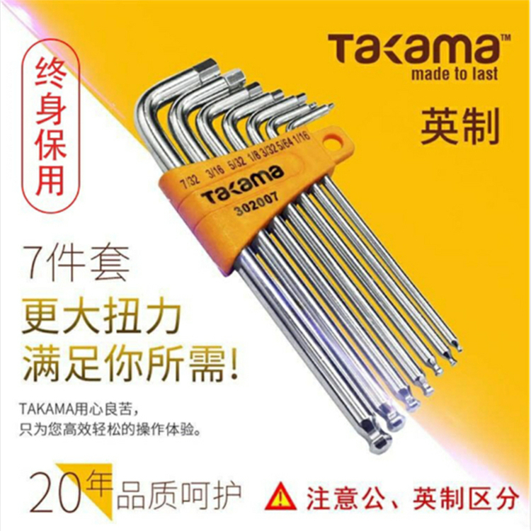 Takama(高松)7件套S2內六角英制球頭扳手組套(加長)適用于六角沉頭螺栓,堅固、省力、耐用。多用途多