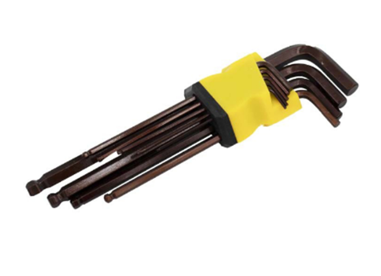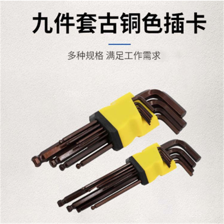 鴻利九件套內六角扳手古銅色S2(插卡)優質CRV鉻釩鋼材質,整體熱處理,韌性好,堅固耐用。表面亮黑強化