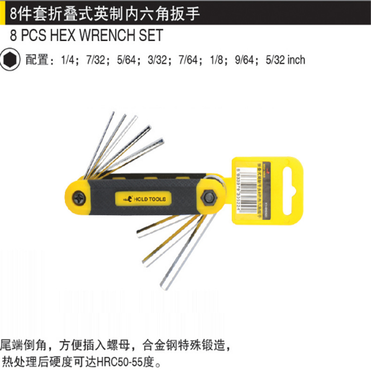 宏遠折疊式英制平頭8件套內六角 采用高碳鋼鍛造而成,高溫淬火熱處理。扭力超強,不易變形,增加工作效