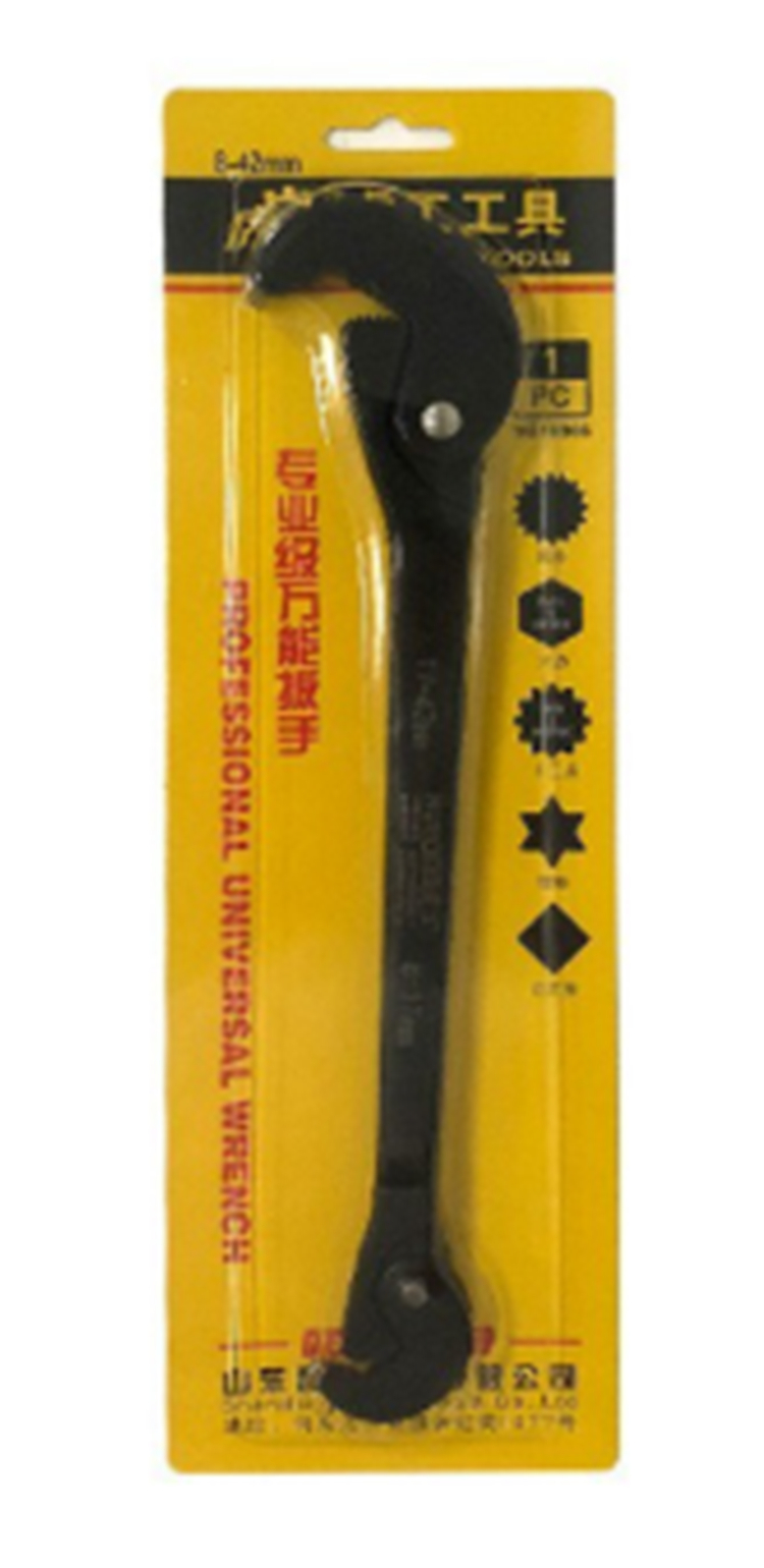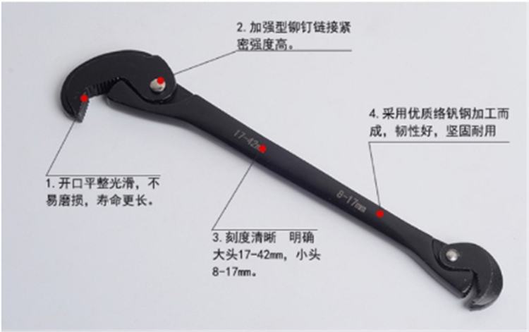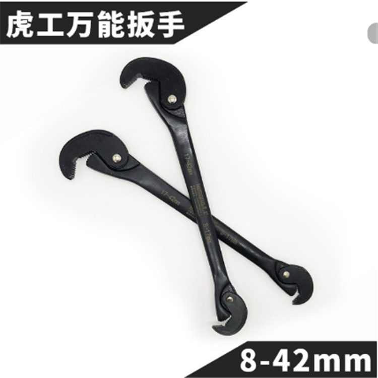 虎工萬能扳手采用碳鋼淬火而成,表面磨砂電鍍處理,耐用耐麿不易掉色,可擰8-42mm的螺絲螺母,輕松快速