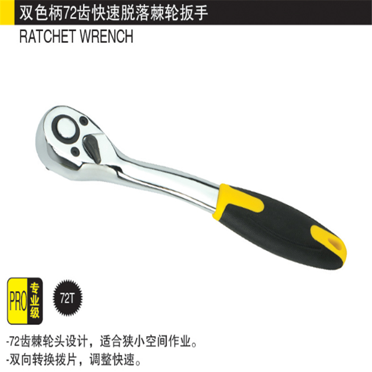 宏遠(yuǎn)雙色柄72齒快速脫落棘輪扳手采用優(yōu)質(zhì)高碳鋼鑄造而成,高溫淬火熱處理,堅(jiān)固耐用,72齒棘輪頭設(shè)計(jì),適