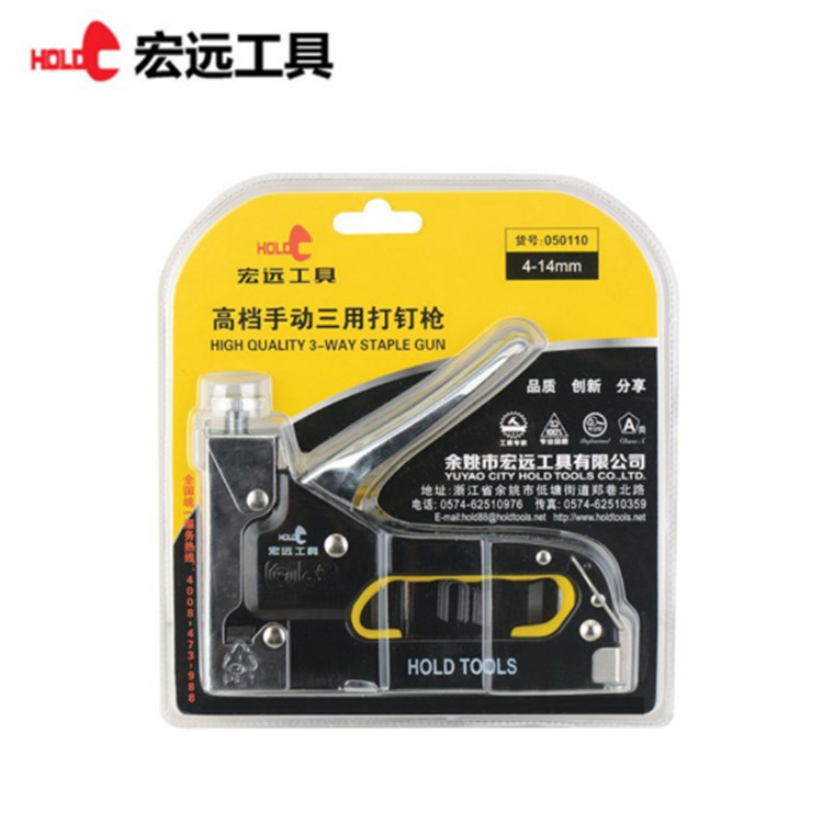 宏遠高檔手動三用打釘槍耐用省力,用途廣泛,可用于固定電線、包裝、畫冊裝訂沙發(fā)、鞍座、木箱、裝潢家具、地板、墻板門窗、廣告、木工等。