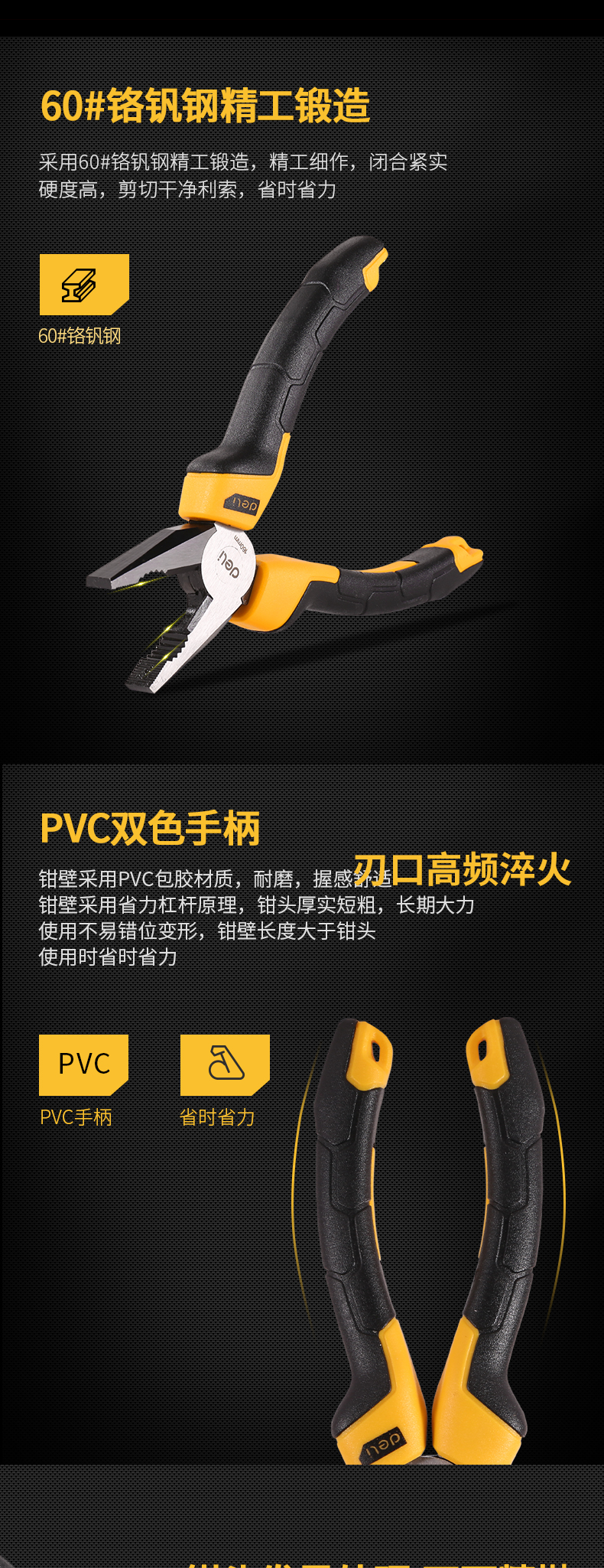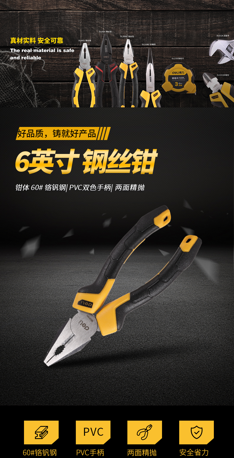 得力老虎鉗子鋼絲鉗采用60#鉻釩鋼精工鍛造,精工細作,閉合緊實硬度高,剪切干凈利索,省時省力。