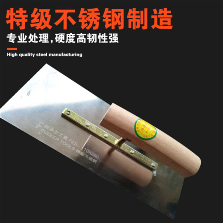 福澤爾不銹鋼抹子木質把手握感舒適,連接一體握柄,便于發力,使用輕松無壓力。