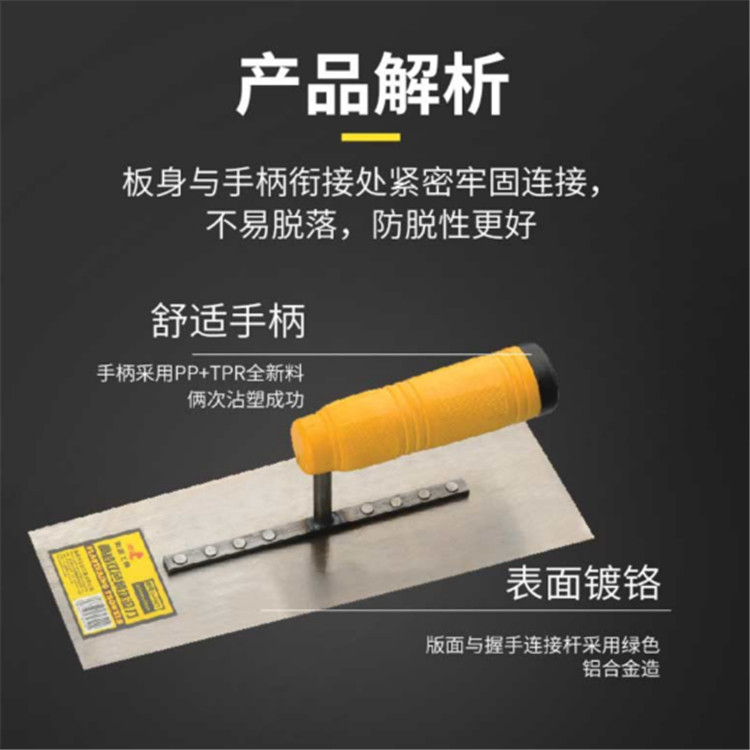 宏遠抹泥刀優質錳鋼材制造,專業處理,硬度高韌性強。使用場景比較多,可用于抹膩子、填縫補裂、水泥攪拌。