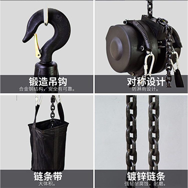 電動葫蘆優(yōu)質(zhì)外殼,堅固耐用,G80級錳鋼鏈條,高效強韌,優(yōu)質(zhì)插頭,安心使用