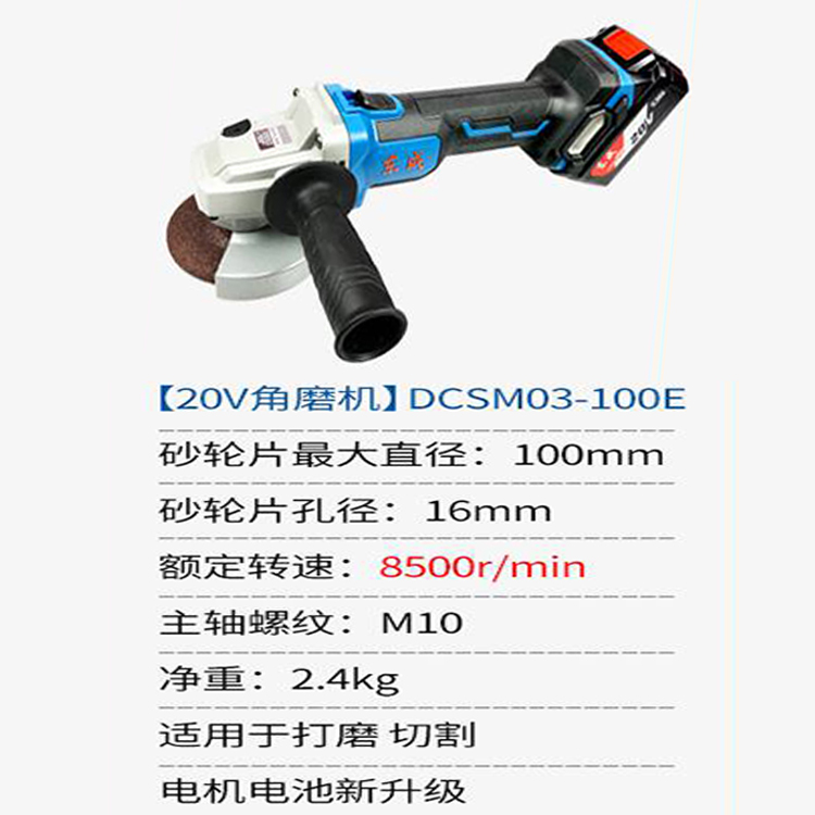 東成充電式無刷細手柄角向磨光機DCSM03-100E,產品參數如圖。