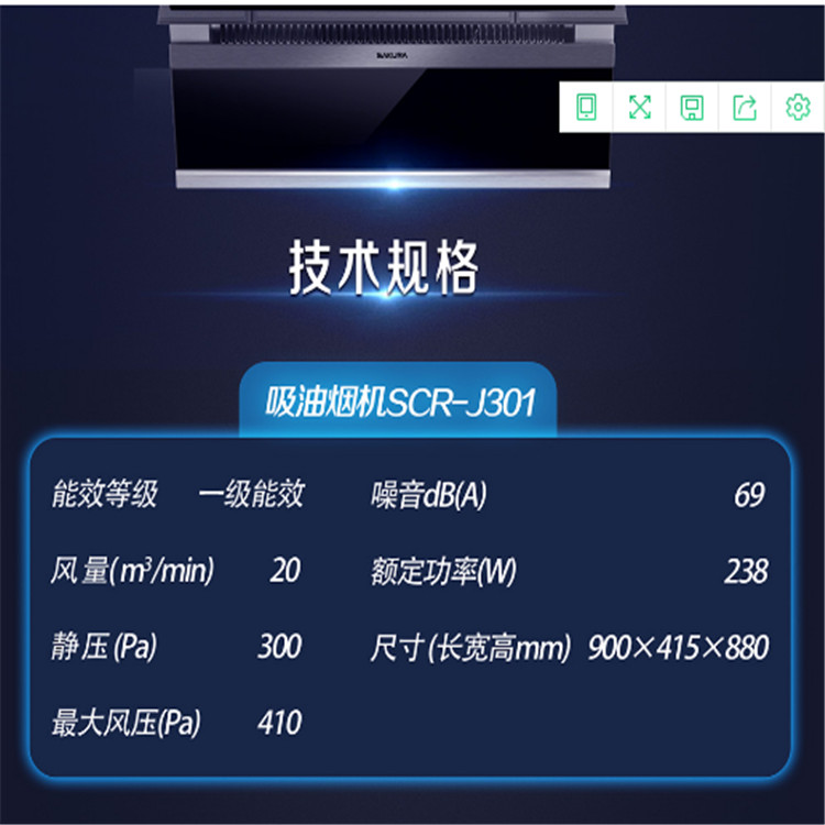 櫻花SCR-J301 雙炫風2.0吸油煙機家用廚房大吸力油煙機技術規格