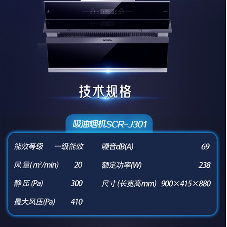 櫻花SCR-J301 雙炫風2.0吸油煙機抽油煙機壁掛式抽煙機家用側吸式脫排吸油煙機技術規格
