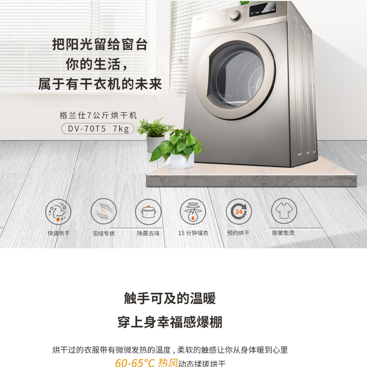 格蘭仕 納米比滾筒干衣機(jī)DV-70T5 60-60°C熱風(fēng)揉搓烘干,
