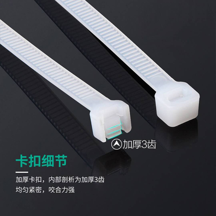 尼龍扎帶加厚卡扣,內部剖析為加厚3齒,均勻緊密,咬合力強。
