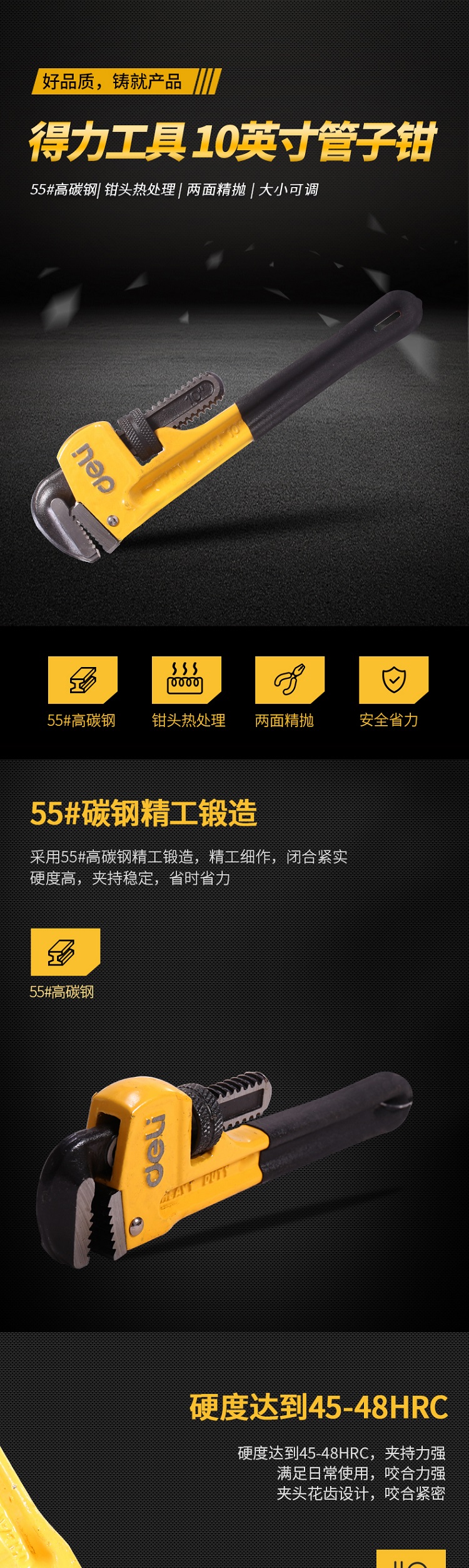 得力管鉗管子鉗55#高碳鋼精工鍛造,整體熱處理,硬度45-48HRC