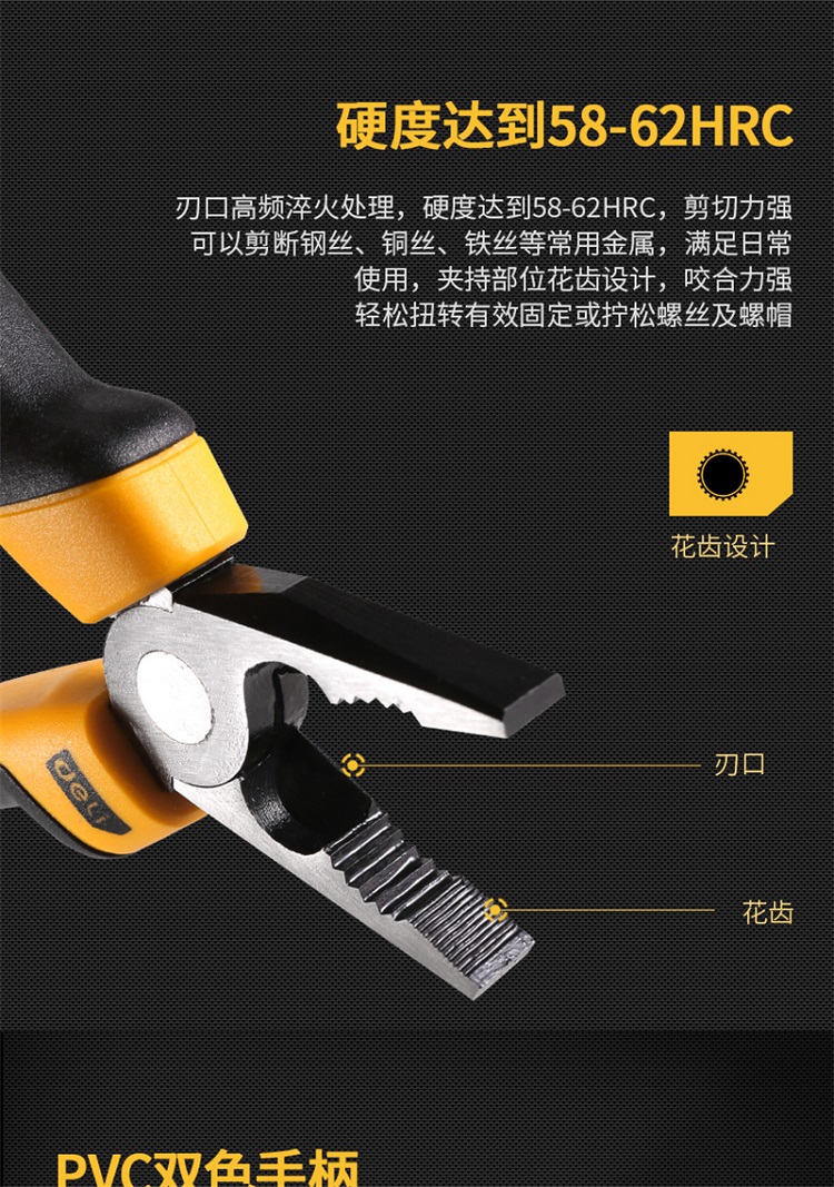 鋼絲鉗刃口高頻淬火,硬度達到58-62HRC,剪切力強