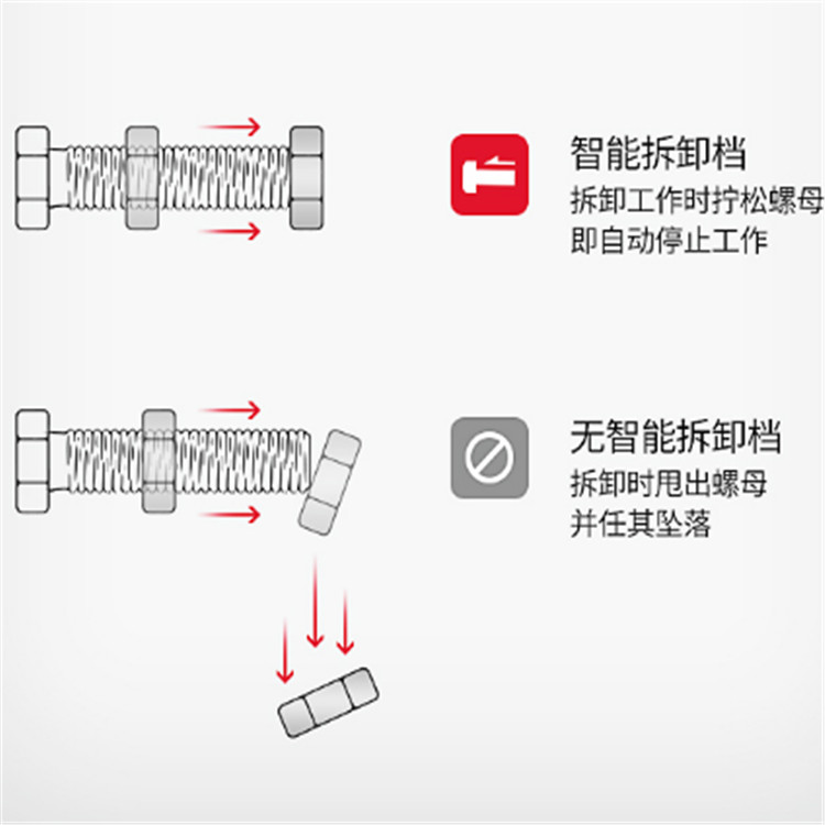 東成充電式無刷沖擊扳手智能拆卸檔,拆卸工作時擰松螺母,即自動停止工作