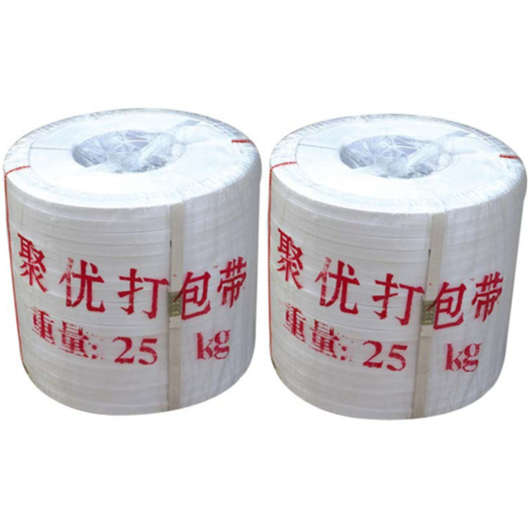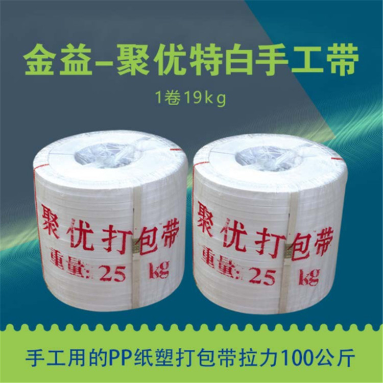 金益 聚優(yōu)特白手工打包帶,廣泛用于鋼鐵、鋁材、纖維、棉紡等捆扎和固定。