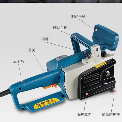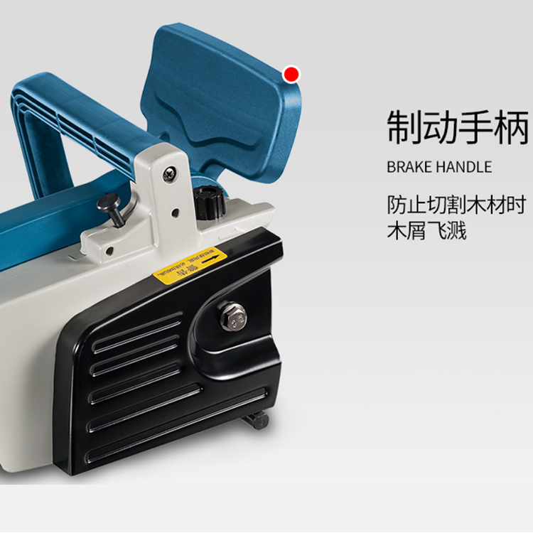東成電鋸伐木鋸M1L-FF03-405家用小型手持電鏈鋸,反保護開關,保護操作安全,按住旁邊的保護按鈕之后,再按開關進行切割操作。