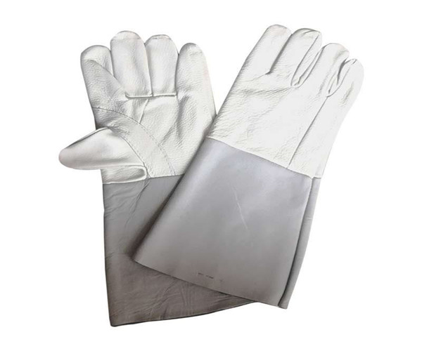 牛盾頭層牛皮全皮長電焊手套淺色產品展示