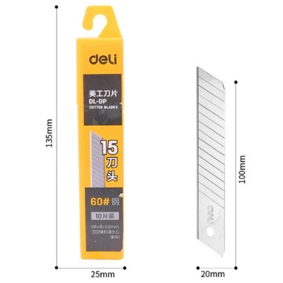 得力18mm美工刀片產品內置10節白刀片,專業刃口磨削設計。