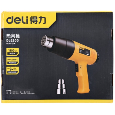 得力熱風槍產品功率1500W,槍頭為不銹鋼,槍身為ABS材料,頭部為玻璃纖維增強尼龍材料。