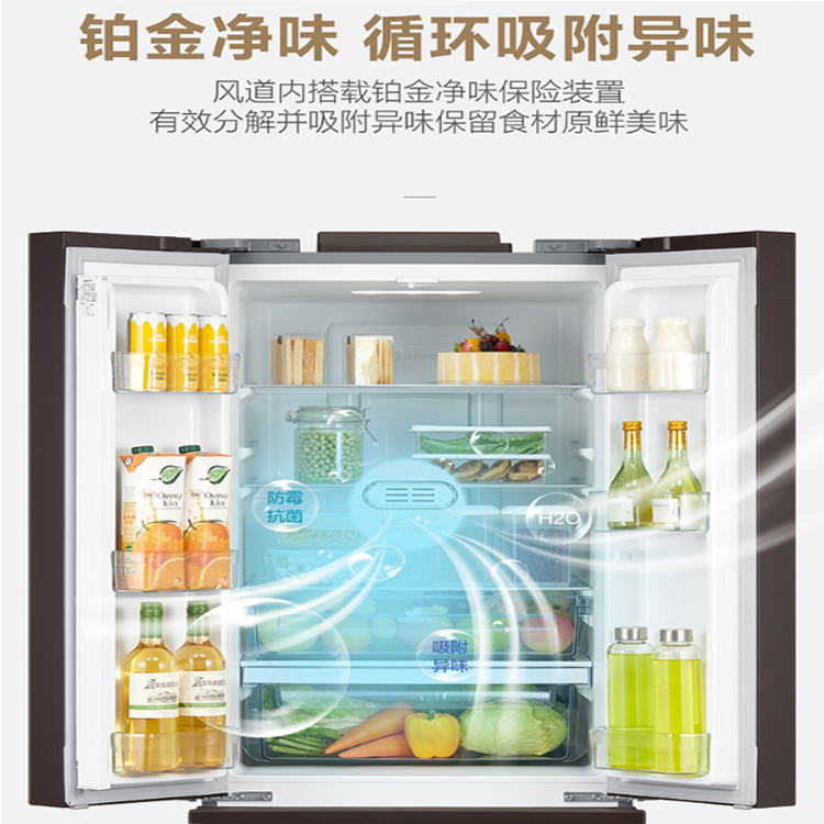 美的多門智能家用冰箱內設鉑金凈味保險裝置,吸附異味保留食材原味。