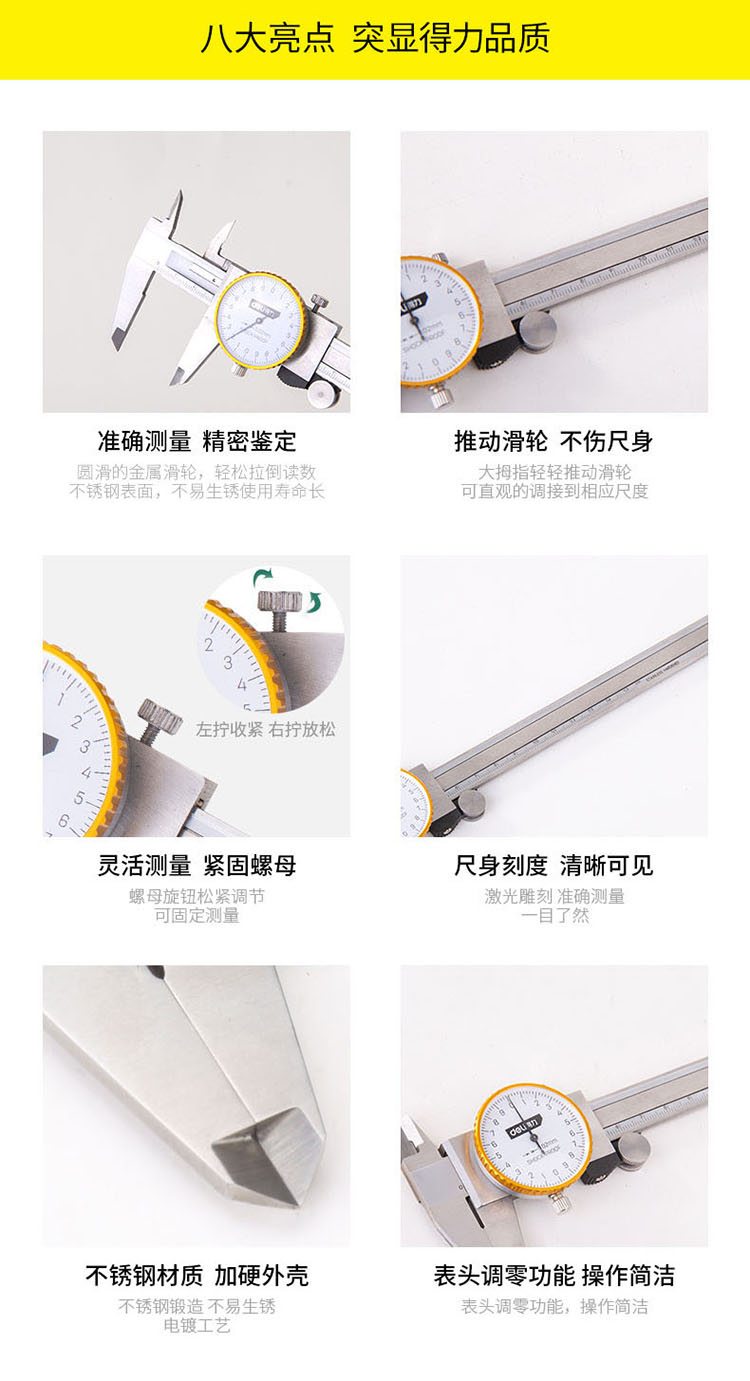 得力帶表游標卡尺高精度表盤式不銹鋼帶表游標卡尺量具DL92150B