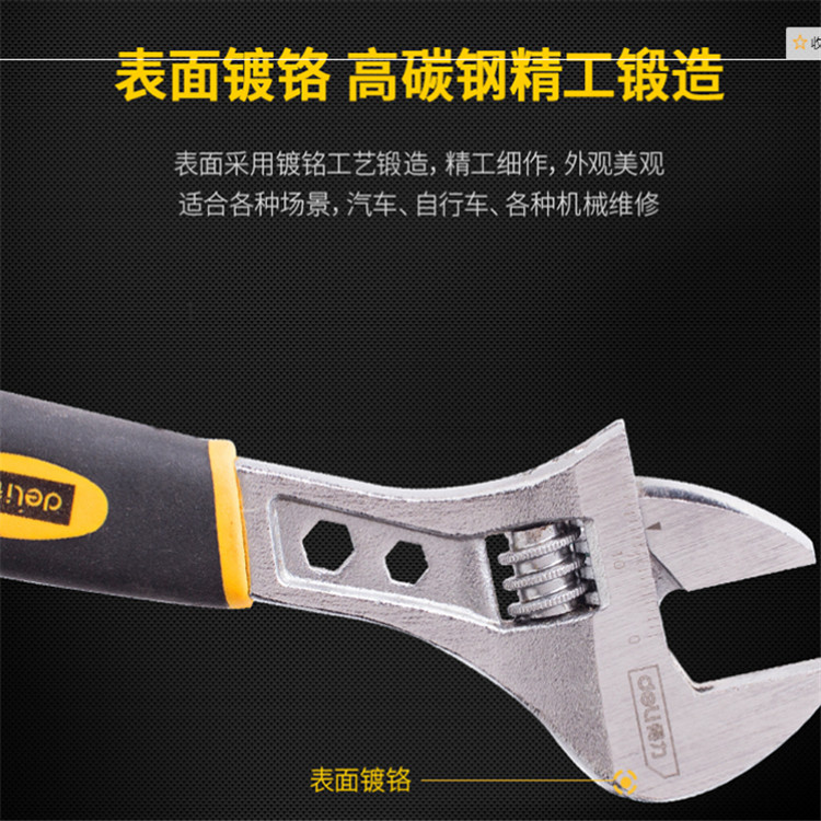 得力塑柄活扳手多功能用優質高碳鋼鍛壓制造,扳體頭部、渦桿硬度HRC40以上。