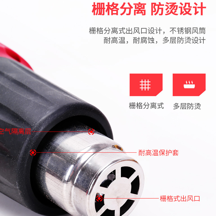 調溫熱風槍柵格分離式出風口設計,不銹鋼風筒耐高溫,耐腐蝕,多層防燙設計