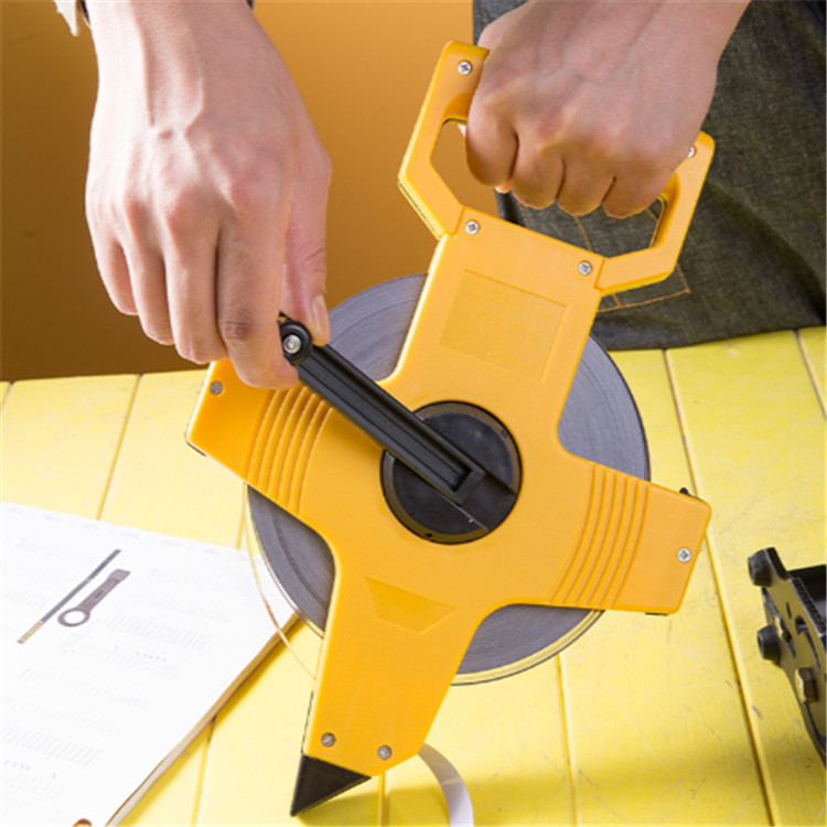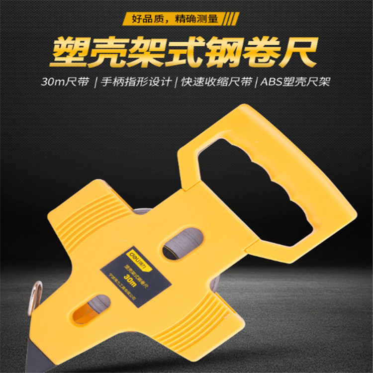 得力塑殼架式鋼卷尺手柄指形設計,舒適防滑。尺帶為60號熱軋卷鋼,放腐耐磨。