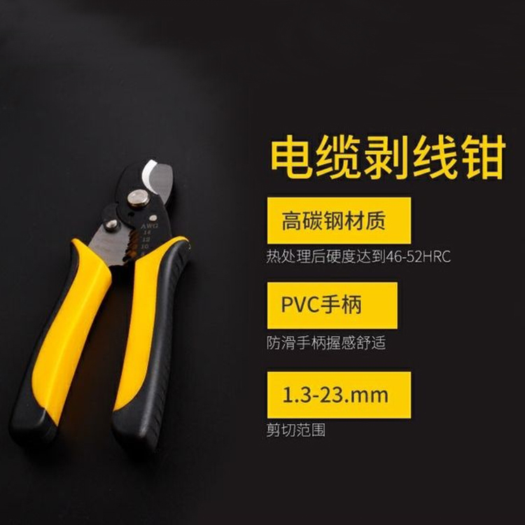 電纜剝線鉗鉗頭材質高碳鋼硬度達到46-52HRC,pvc防滑手柄。