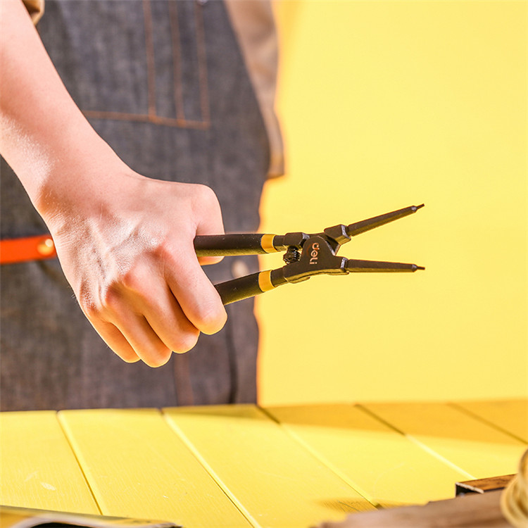 得力外直卡簧鉗采用雙色沾塑手柄,手感舒適,防滑耐油