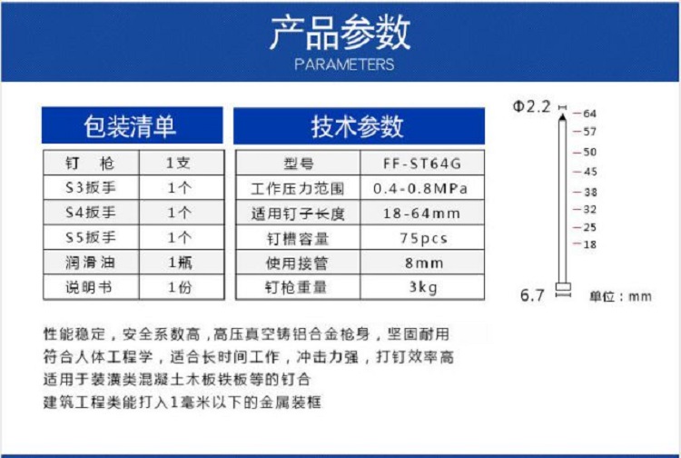 東成FFST64G氣動鋼釘槍東成工具基本參數