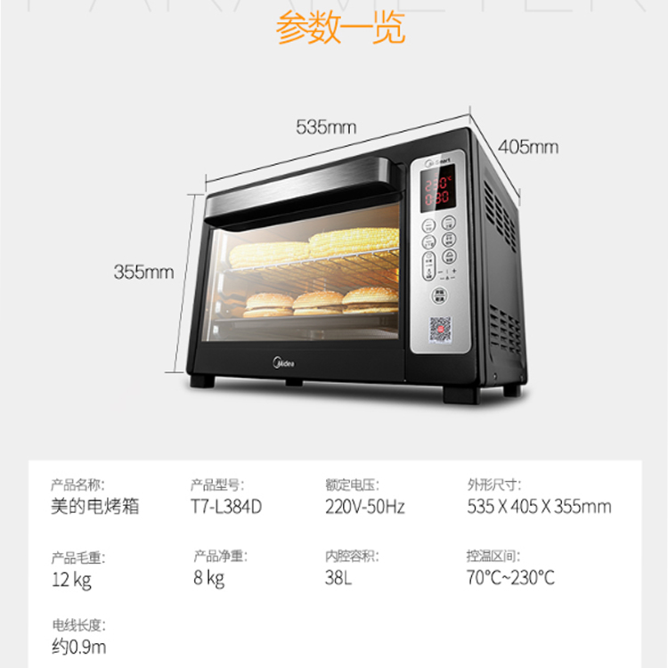 美的(Midea)T7-L384D 家用多功能烤箱 智能電烤箱 38升大容量 小京魚App控制