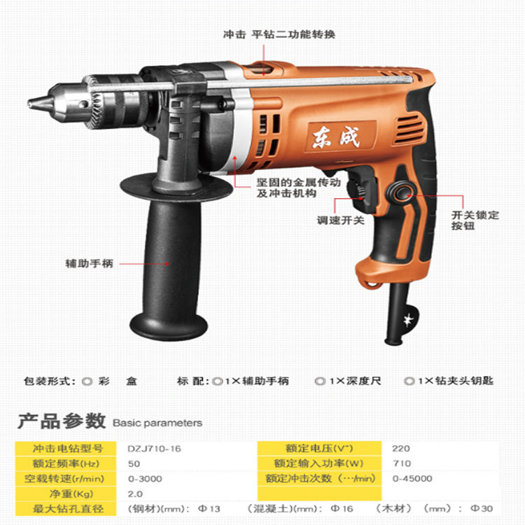 東成沖擊電鉆DZJ710-16適用于對混凝土地板、墻壁、磚塊,石料