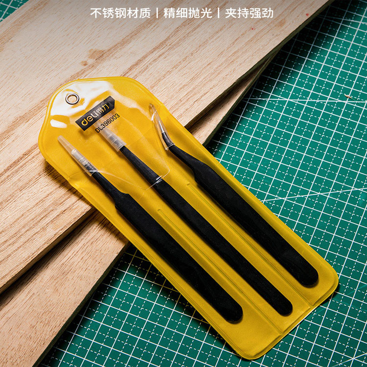 得力鑷子三件套不銹鋼家用維修長直工具捏夾子彎頭
