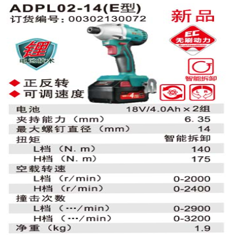DCA充電式沖擊起子機ADPL02-14(E型)結構新穎、體積小、重量輕、安全可靠。
