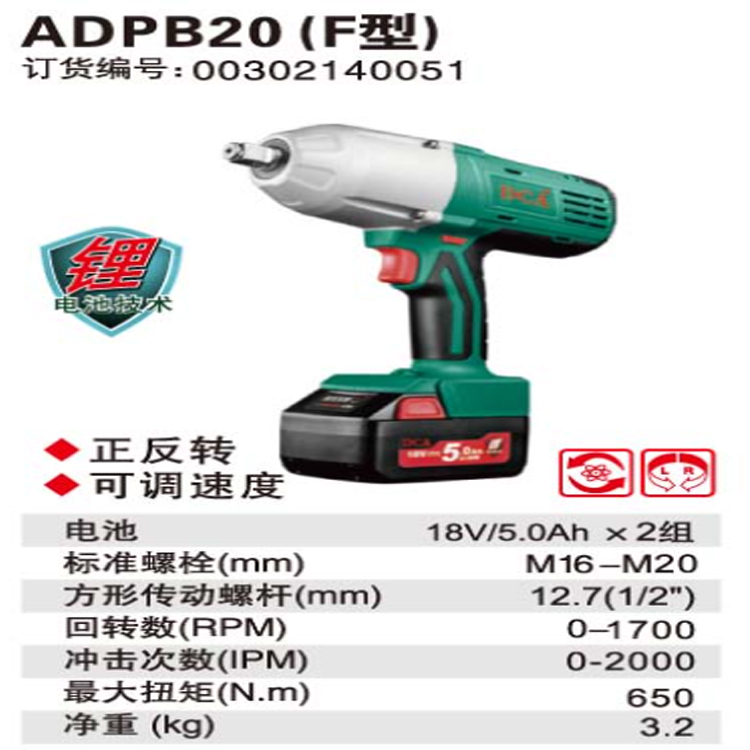 DCA充電式沖擊扳手ADPB20(F型)耗電量少、噪聲小、調節靈活、