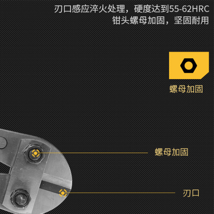 鉗頭采用Cr-Mo合金鋼鍛造,鏡面拋光,刃口高頻淬火,硬度達到55-62HRC。