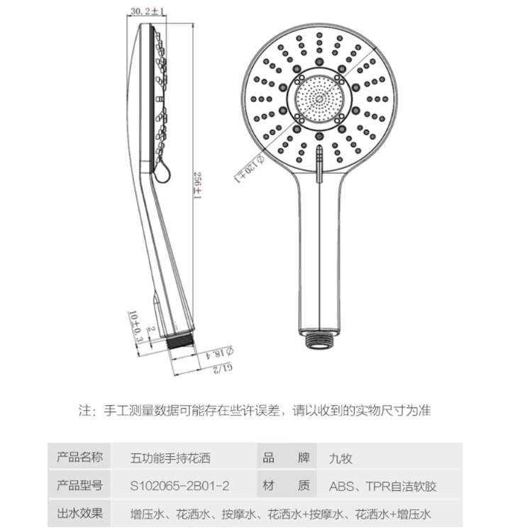 五功能手持增壓淋浴花灑噴頭明“凈”視界,快速除垢TPR自潔水咀,輕按軟膠,