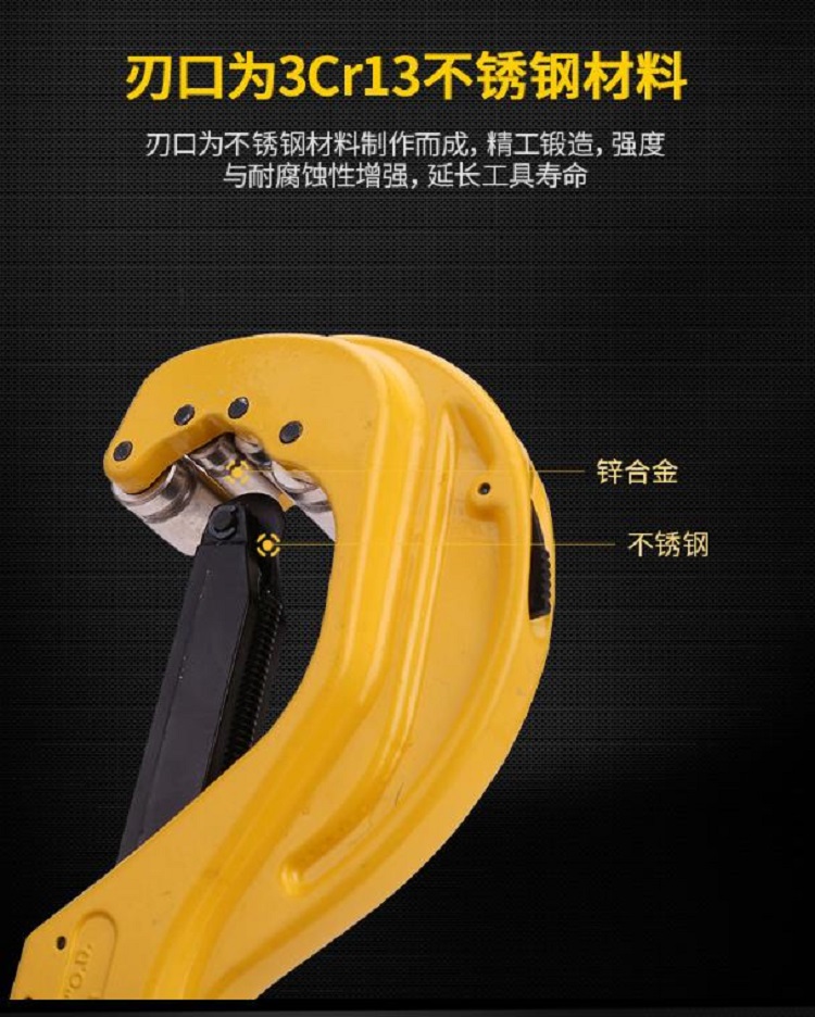 得力金屬管子割刀產品刀口采用SICR合金刃具鋼, 經熱處理后硬度可達52-62HRC,切削鋒利。