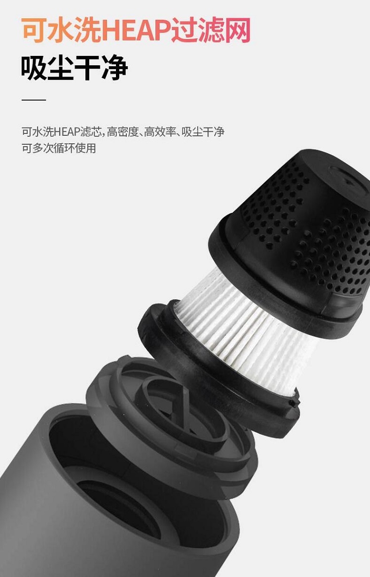 手持式汽車吸塵器設計可水洗HEAP過濾網,高密度、高效率、吸塵干凈