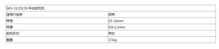 SKS-32/25/19 手動鎖扣機:機采用優質金屬制造而成硬度高,前端打包帶固定點防止打包帶走偏或脫落。