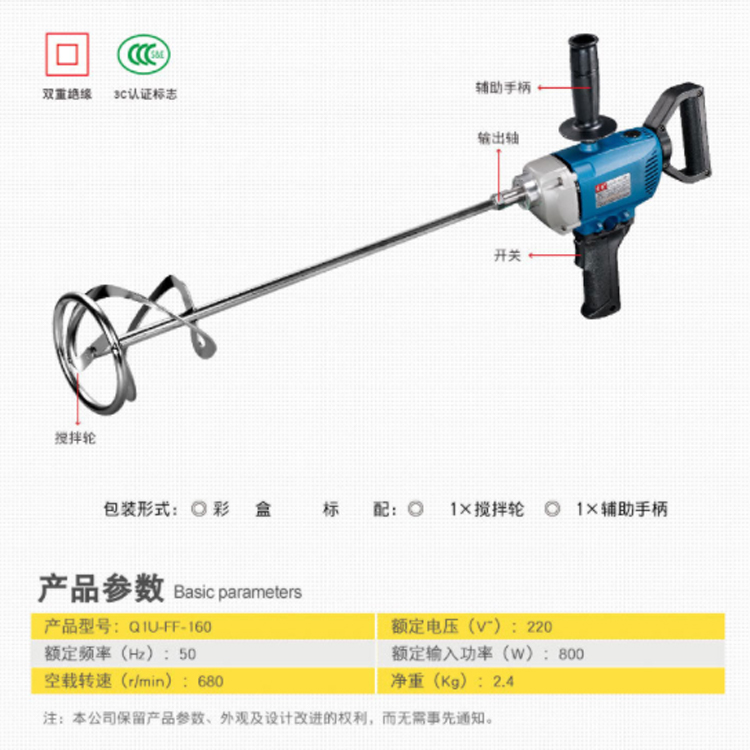 東成攪拌機Q1U-FF-160工業攪拌鉆可用于:膩子涂料、油漆、混凝土、水泥攪拌
