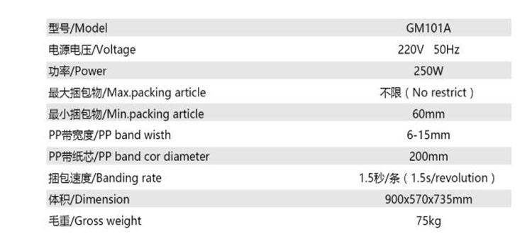 光明牌PP帶打包機電動高臺半自動打包機 參數展示圖