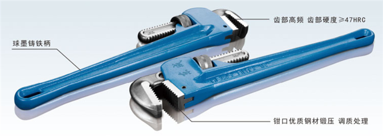 東成重型管子鉗齒部高頻,鉗口優質鋼材鍛壓 調質處理, 齒部硬度≥47HRC球墨鑄